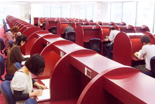 特に毎年生徒から好評なのが「自習室」です。セパレートタイプの広い机、高級感あるチェリーレッドの木目、目が疲れない専用のデスクライト、床全面に敷かれたじゅうたん、やわらかいクッションチェア。待ち時間なしでいつでも利用でき、席取り競争の必要もありません。勉強に集中できるように管理も徹底しており、私語は一切禁止。広くて快適な空間で朝から夜まで勉強に集中できます。