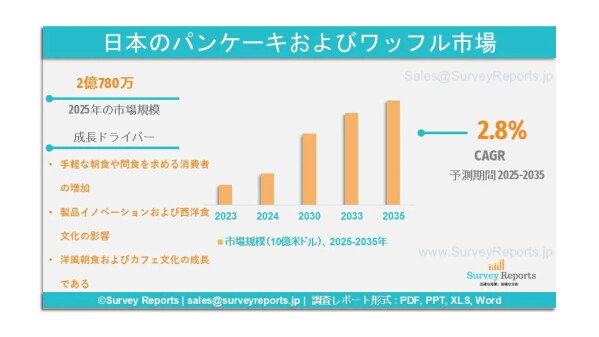 Survey Reports LLCは、2026年1月に「日本のパンケーキおよびワッフル市場:製品別(ワッフル[フレッシュ、冷凍]、パンケーキ[フレッシュ、冷凍])、流通チャネル別(ホスピタリティ[シティホテル、ビジネスホテル、リゾート、和風ホテル、航空会社ラウンジ]、フードサービス[レストランおよびクイックサービス、施設向け])―グローバル市場分析、トレンド、機会および予測、2025年〜2035年」と題する調査レポートを発行したと発表した。本レポートは、日本のパンケーキおよびワッフル市場に関する予測評価を提供するものであり、成長要因、市場機会、課題、脅威など、同市場における主要な市場ダイナミクスを明らかにするものである。