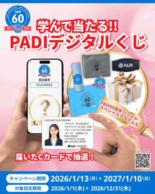 スクーバダイビングの教育機関であるPADI(株式会社パディ・アジア・パシフィック・ジャパン、本社:東京都中央区 代表取締役:伊東正人)は、60周年記念企画の第一弾として、「学んで当たる!PADI デジタルくじ」を実施します。