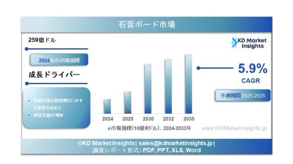 KD Market Insightsは、「石膏ボード市場の将来動向および機会分析 ― 2025年~2035年」と題した市場調査レポートの発行を発表できることを嬉しく思います。本レポートの市場範囲は、現在の市場動向および将来の成長機会に関する情報を網羅しており、読者が十分な情報に基づいたビジネス意思決定を行えるよう設計されています。本調査レポートでは、KD Market Insightsの研究者が一次調査および二次調査の分析手法を活用し、市場競争の評価、競合他社のベンチマーキング、ならびに各社のGTM(Go-To-Market)戦略の理解を行っています。