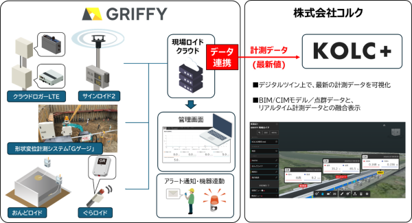 株式会社GRIFFY(本社:東京都千代田区、代表取締役 入澤 拓也、以下「GRIFFY」)は、2026年1月よりGRIFFYが提供する「現場ロイドクラウド」上に収集した計測データを、株式会社コルク(本社:東京都豊島区、代表取締役 堤 正雄)が提供するBIM/CIMクラウド「KOLC+」と連携し、デジタルツイン上に計測データのサマリーを一元表示可能になったことをお知らせいたします。