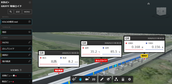 上記サービスで計測されたデータはクラウドに送信され、グラフ表示やアラートメール通知などが可能になっています。今回、データ連携機能の実装により、「KOLC+」で構築したデジタルツイン上で、現場ロイドクラウドの最新の計測データを可視化できるようになりました。BIM/CIMの3次元データと、リアルタイム計測データを融合して表示することが可能となることで、俯瞰的なデータ把握を通じて品質管理や安全管理を効果的に行うことが期待できます。