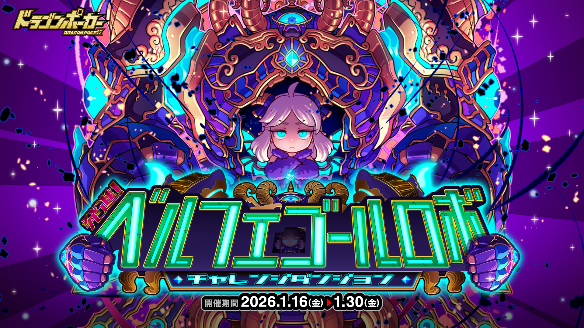株式会社アソビズム(本社:東京都千代田区、代表取締役:大手智之)は、App Store・Google Playにて 好評配信中のリアルタイム合体カードバトル『ドラゴンポーカー』で、2026年1月16日(金)よりチャレンジダンジョン「発進!ベルフェゴールロボ」を開催いたします。