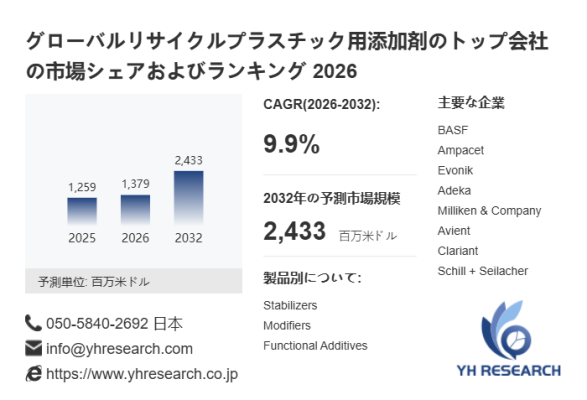 YH Researchによるとのグローバルリサイクルプラスチック用添加剤の市場は2025年の1259百万米ドルから2032年には2433百万米ドルに成長し、2026年から2032年の間にCAGRは9.9%になると予測されている。