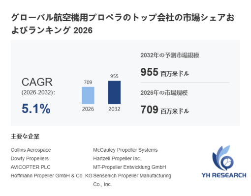 YH Researchによるとのグローバル航空機用プロペラの市場は2025年の672百万米ドルから2032年には955百万米ドルに成長し、2026年から2032年の間にCAGRは5.1%になると予測されている。