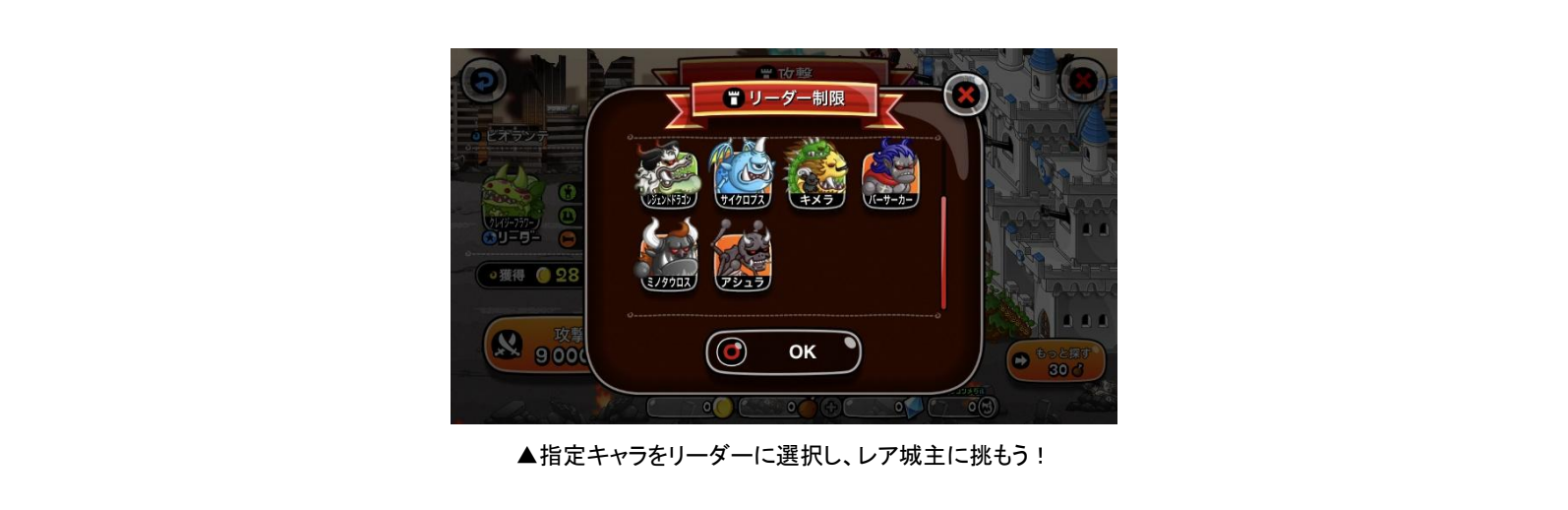 「バトル」から「ひとりで」または「みんなで」を選び、「攻撃」を選択すると、ランダムでレア城主が出現する「レア城主イベント」を開催いたします。「レア城主」に遭遇できた際は指定キャラをリーダーにして挑むことができ、勝利すれば大量のキーンを入手できます。