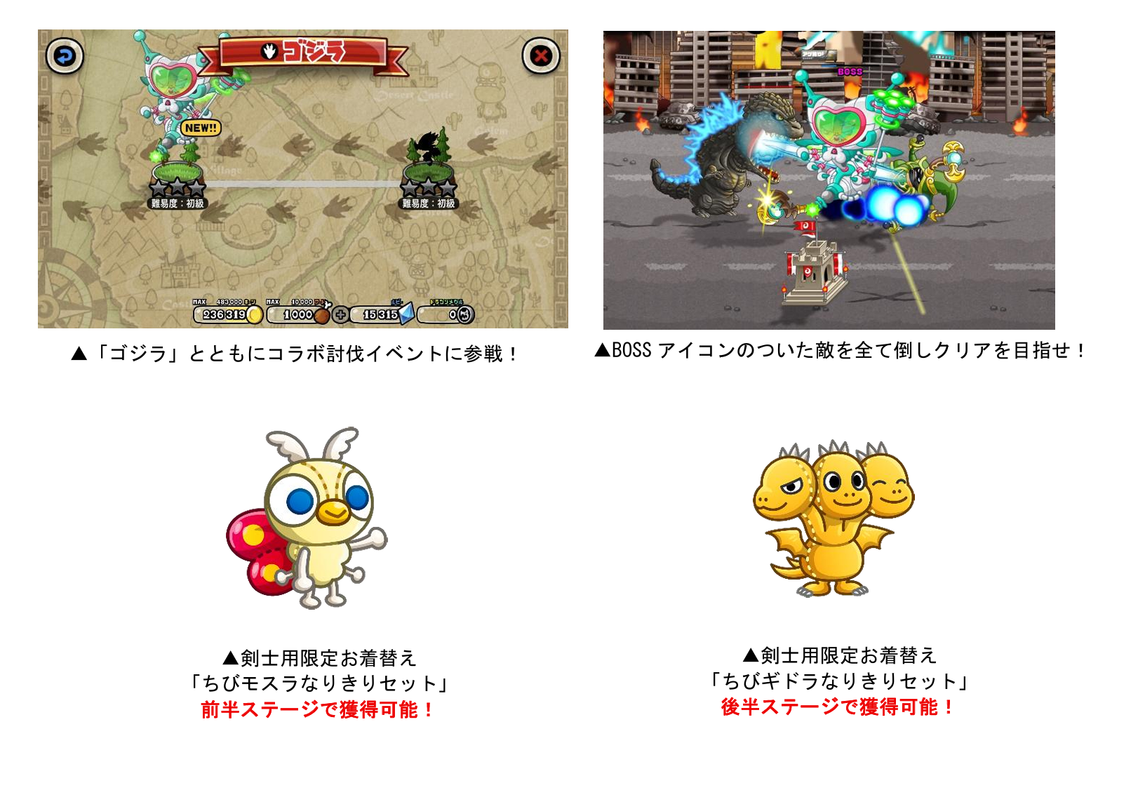 1月16日(金)19:00より、『ゴジラ』との復刻コラボイベントを開催いたします。期間中は「メカゴジラ」「ビオランテ」「ファイヤーラドン」たち怪獣をモチーフとした城ドラキャラの激レアお着替えや、「ちびビオランテ」たちになりきれる剣士お着替えがコラボ限定で登場します。今回も前半と後半に分かれての開催となり、イベントの一部が変化します!さらに、「大怪獣のアバたまチケット」10枚がもらえるログインボーナスなど報酬も盛りだくさんな期間限定のコラボとなっておりますので、ぜひお楽しみください。