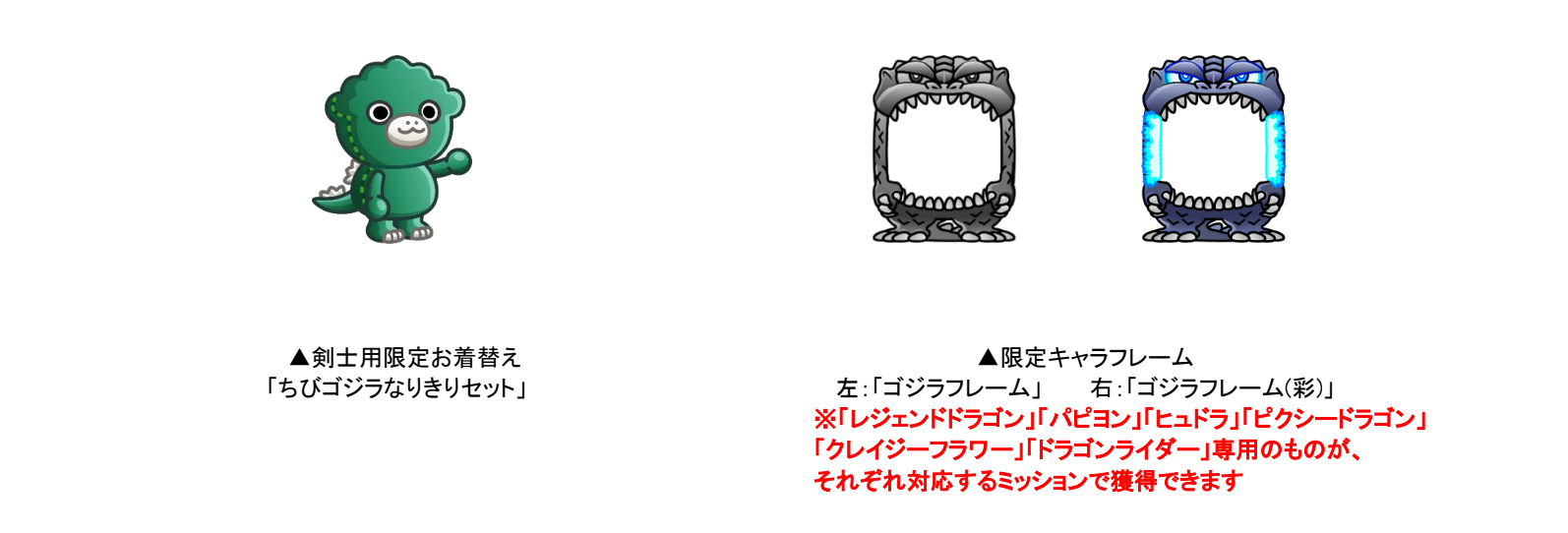コラボ期間中、「ゴジラコラボミッション」が登場!一定数クリアすれば剣士用限定お着替え「ちびゴジラなりきりセット」や「大怪獣のアバたまチケット」がもらえます。さらにキャラフレームとして「ゴジラフレーム」と「ゴジラフレーム(彩)」も登場し、それぞれのミッションで対応するキャラ専用のものが入手できます。ぜひすべての報酬獲得を目指して挑みましょう。