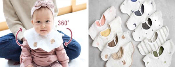popomiのスタイは、360度使える円形デザイン。よだれで濡れても、乾いた面をくるっと前に回せるので、細かい着替えの手間が減ります。また、裏表で使えるリバーシブル仕様で、柄と無地をコーディネートに合わせて楽しめるのも人気のポイントです。
