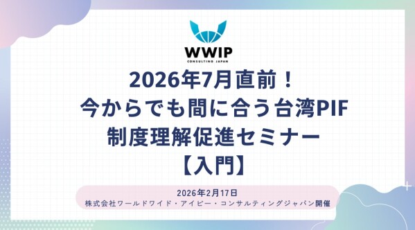 株式会社ワールドワイド・アイピー・コンサルティングジャパン (以下「WWIP」 : 東京都文京区) は、2026年2月17日(火)14:00〜16:00に、「2026年7月直前!今からでも間に合う台湾PIF制度理解促進セミナー【入門】」を開催いたします。
