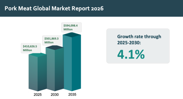 2025年における世界の豚肉市場規模は約4,106.265億ドルに達し、2020年以降、年平均成長率(CAGR)4.5%で拡大しました。市場は2025年の4,106.265億ドルから2030年には5,018.693億ドルへと成長し、成長率は4.1%と見込まれています。2030年以降は成長が緩やかになり、CAGR3.4%で拡大し、2035年には5,940.984億ドルに達すると予測されています。