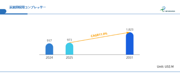 LP Information調査チームの最新レポートである「世界炭素回収用コンプレッサー市場の成長予測2025~2031」(https://www.lpinformation.jp/reports/565426/carbon-capture-compressor)によると、2025年から2031年の予測期間中のCAGRが11%で、2031年までにグローバル炭素回収用コンプレッサー市場規模は18.23億米ドルに達すると予測されている。