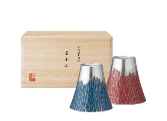 日本の伝統工芸「大阪錫器」より、富士山をモチーフにした錫製タンブラー小(180ml)の青・朱ペアセット。