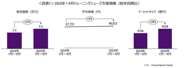 日本の2025年1-9月のトレーニングシューズ市場規模は238億円、前年同期比28%増と、大きく成長しました(図表1)。販売個数がおよそ300万足と、前年同期比で23%、足数にして約60万足増加したことが寄与しました。