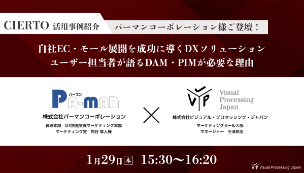 自動車関連ツール・パーツの専門商社として高い評価を受けている株式会社パーマンコーポレーション様をお招きし、「CIERTO DAM|PIM」の利用目的や具体的な管理体系、商品情報をDX担当者様より特別にお話頂きます。