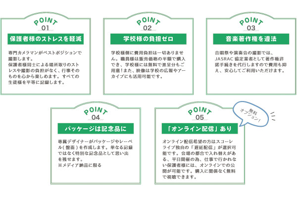 本サービスは、元よりあった教育分野専門の映像サービスをアフターコロナ時代の教育分野にマッチするようにブラッシュアップしたもので小学校、中学校、高校の合唱コンクール、運動会/体育祭、文化祭・ステージ、卒業式などの学校行事を対象とした高品質映像収録サービスです。