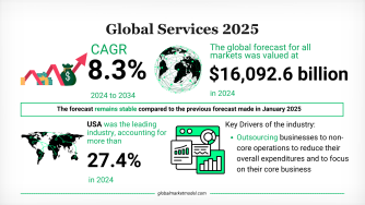 サービス産業は2024年に世界国内総生産の13.3%を占め、一人当たり年間消費額は1,843ドルに達した。業界の成長モメンタムの多くは、企業がコスト構造を再評価し、内部資源を中核機能に集中させていることに由来している。アウトソーシングは従来の情報技術や顧客対応業務にとどまらず、施設管理、リース、物流、専門的な事業支援分野へと拡大している。