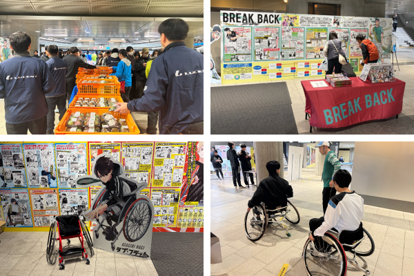 『BREAK BACK』©KASA(秋田書店)2018は月刊少年チャンピオンで長期連載中の人気漫画。作中に登場するキャラクターで、ルーセント契約選手の百瀬拓真の大型パネルなどが設置され、多くの人の目を引きました。