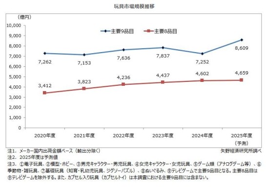 2025年度における玩具市場規模(メーカー国内出荷金額ベース)を、主要8品目で4,659億円(前年度比1.2%増)、主要9品目では8,609億円(同18.7%増)と予測する。
