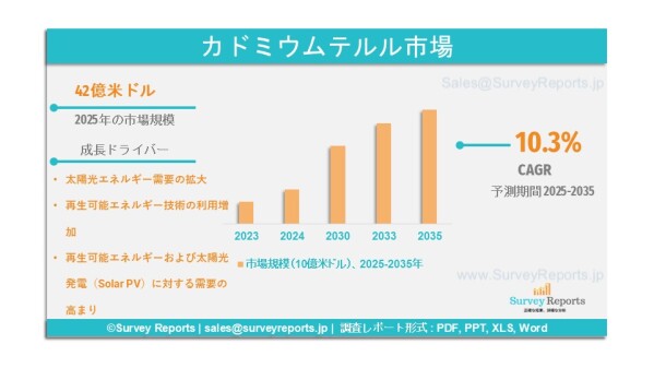 Survey Reports LLCは、2026年1月に調査レポート「カドミウムテルル市場:供給源別(テルル、カドミウム)、用途別(太陽光発電、光学レンズ・窓材、電気光学変調器、原子核分光および赤外光学材料)、エンドユーザー別(住宅、商業、産業、ユーティリティ)―世界市場分析、動向、機会および予測、2025~2035年」を発行したと発表した。本レポートは、カドミウムテルル市場に関する予測評価を提供するものであり、成長要因、市場機会、課題、脅威など、同市場における複数の主要な市場ダイナミクスを明らかにするものである。