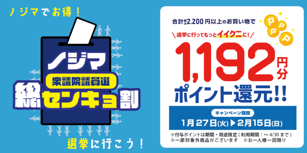 株式会社ノジマ(神奈川県横浜市、代表執行役社長・野島廣司)は、2026年2月8日(日)の衆議院議員総選挙の実施を受け、投票済証明書を提示することで特典が受けられる「センキョ割」(後援:センキョ割学生実施委員会)を実施することをお知らせいたします。2022年の参院選にて初めてセンキョ割に参加し、5年目に突入する今回は「ノジマ 総センキョ割」と題して、還元額も1,192(イイクニ)ポイントと過去最大級の規模となります。