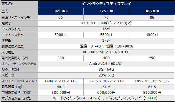 <製品ラインアップと主な仕様、市場想定価格>