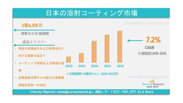 Survey Reports LLCは、2026年1月に調査レポート「日本の溶射コーティング市場:製品別(金属、セラミックス、金属間化合物、ポリマー、炭化物、アブラダブル材料、その他)、技術別(コールド、フレーム、プラズマ、高速フレーム溶射(HVOF)、電気アーク、その他)、用途別(航空宇宙、産業用ガスタービン、自動車、医療、印刷、石油・ガス、鉄鋼、パルプ・紙、その他)―市場分析、動向、機会および予測、2025年~2035年」を発行したと発表した。本レポートは、日本の溶射コーティング市場に関する予測評価を提供するものであり、成長要因、市場機会、課題、脅威など、同市場における複数の主要な市場ダイナミクスを明らかにしている。