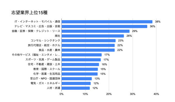 志望業界では、「IT・インターネット・モバイル・通信」が38%で最多となり、デジタル分野への関心の高さがうかがえます。次いで「テレビ・マスコミ・広告・出版・芸能」が続き、その後は「金融・証券・保険・クレジット・リース」「商社」など、業界理解や専門性が求められる分野が並びます。さらに、「コンサル・シンクタンク」「旅行代理店・航空・ホテル」「食品・水産・農林」も同程度の割合となっており、志望業界が特定分野に偏らず、幅広く分散している点が特徴です。