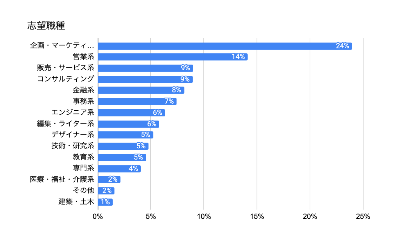 志望職種の内訳を見ると「企画系」が約54%で最も多く、次いで「営業系」が約37%、「販売・サービス系」が約24%となりました。将来的なキャリア形成を見据え、裁量や成長機会のある職種を志望する傾向が見られます。