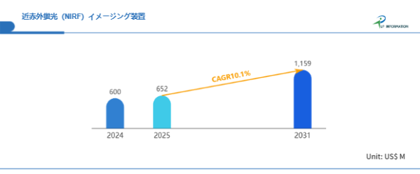 LP Information調査チームの最新レポートである「世界近赤外蛍光(NIRF)イメージング装置市場の成長予測2025~2031」(https://www.lpinformation.jp/reports/57610/near-infrared-fluorescence--nirf--imaging-device)によると、2025年から2031年の予測期間中のCAGRが10.1%で、2031年までにグローバル近赤外蛍光(NIRF)イメージング装置市場規模は11.59億米ドルに達すると予測されている。