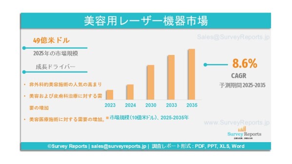 Survey Reports LLCは、2026年1月に「美容用レーザー機器市場:デバイスタイプ別(パルスレーザー、連続波レーザー、Qスイッチレーザー、フラクショナルレーザー、その他)、用途別(脱毛、皮膚若返り、タトゥー除去、血管病変、その他)、エンドユーザー別(皮膚科クリニック、メディカルスパ、病院、美容外科センター、その他)―世界市場分析、動向、機会および予測、2025年~2035年」と題する調査レポートを発行したと発表した。本レポートは、美容用レーザー機器市場に関する予測評価を提供するものであり、成長要因、市場機会、課題、脅威など、同市場における主要な市場ダイナミクスを明らかにしている。