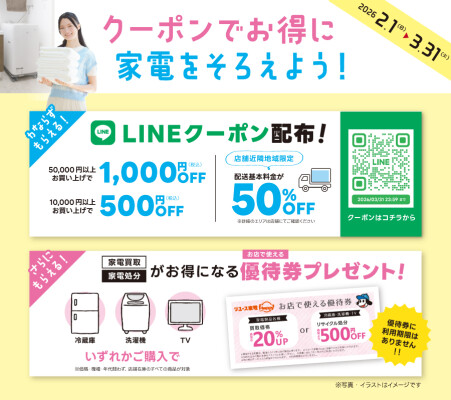 本キャンペーンでは、新生活を始める方や買い替えを検討している方に向けて、割引クーポンの配布や配送割引など、嬉しい特典をご用意しました。