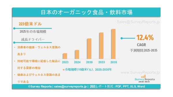 Survey Reports LLCは、2026年1月に調査レポート「日本のオーガニック食品・飲料市場:製品別(オーガニック食品、オーガニック飲料)、流通チャネル別(スーパーマーケット/ハイパーマーケット、専門店、コンビニエンスストア、オンライン販売チャネル、その他)―市場分析、トレンド、機会および予測(2025~2035年)」を発行したと発表した。同レポートは、日本のオーガニック食品・飲料市場に関する将来予測評価を提供するものであり、成長要因、市場機会、課題、ならびに脅威といった複数の主要な市場ダイナミクスを明らかにするものである。
