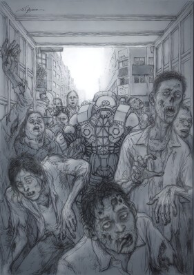 また、作中に登場する対ゾンビ用パワードスーツ「ZIM」のデザインを、ゲーム、アニメでおなじみの『マブラヴ』シリーズや『デモンベイン』シリーズのメカニックデザイン、特撮作品『仮面ライダー鎧武』のクリーチャーデザインなど、多彩なジャンで活躍するNiθ氏が担当。ホラーファン、SFファン必読の作品です!