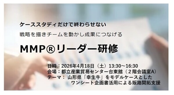 一般社団法人 日本観光文化協会(東京都北区赤羽西1-22-15:会長 小塩稲之)と連携する一般社団法人 日本販路コーディネータ協会では、MMPリーダー研修を2026年4月18日(土)に実施します。会場は都立産業貿易センター台東館(2階会議室A)です。今回のテーマは「 山形県『幸生牛(さちうぎゅう)』をモデルケースとしたワンシート企画書活用による販路開拓支援」です。当日は講師と受講者によるグループワークを通して、戦略・企画会議における新たな解決策のアクションプラン作成スキームを伝授します。