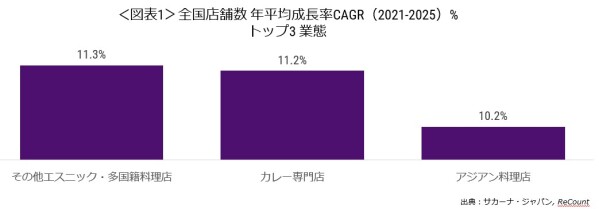 本分析レポートでは、大きく以下のことが分かります。日本全国の飲食店の店舗数の2021-2025年における年平均成長率(CAGR)のトップ3業態は、その他エスニック・多国籍料理店11.3%増、カレー専門店11.2%増、アジアン料理店10.2%増でした。