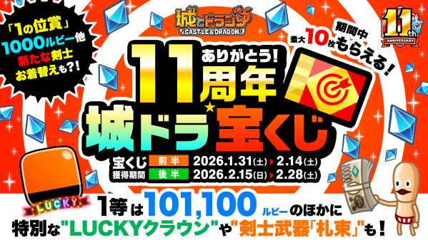 城ドラ最強運試し!「ありがとう11周年☆城ドラ宝くじ」が登場!1等で最高101,100ルビーが当たるほか、特別な“LUCKYクラウン”や、剣士の限定武器“札束”を。また、1の位賞当選者には1,000ルビーに加え、新・限定剣士お着替えを進呈!一部の当選が発表されるくじの抽選は、3月上旬の城ドラ公式YouTube生配信にて実施予定です。