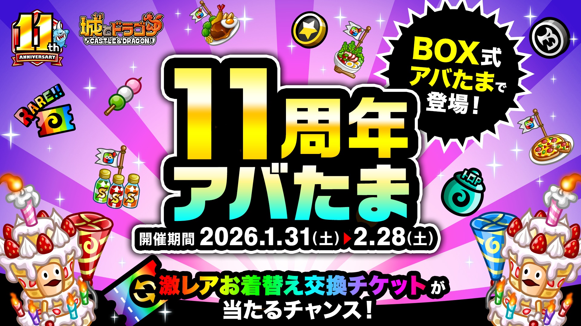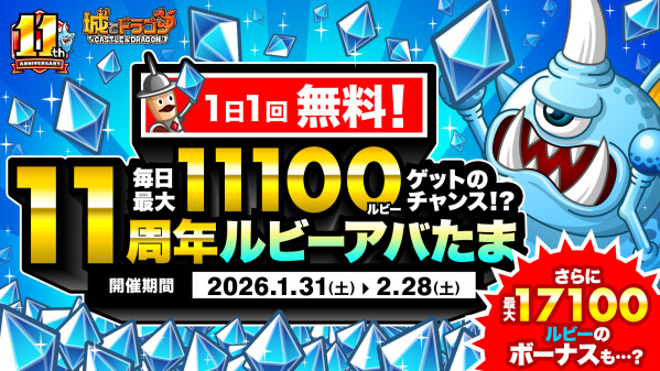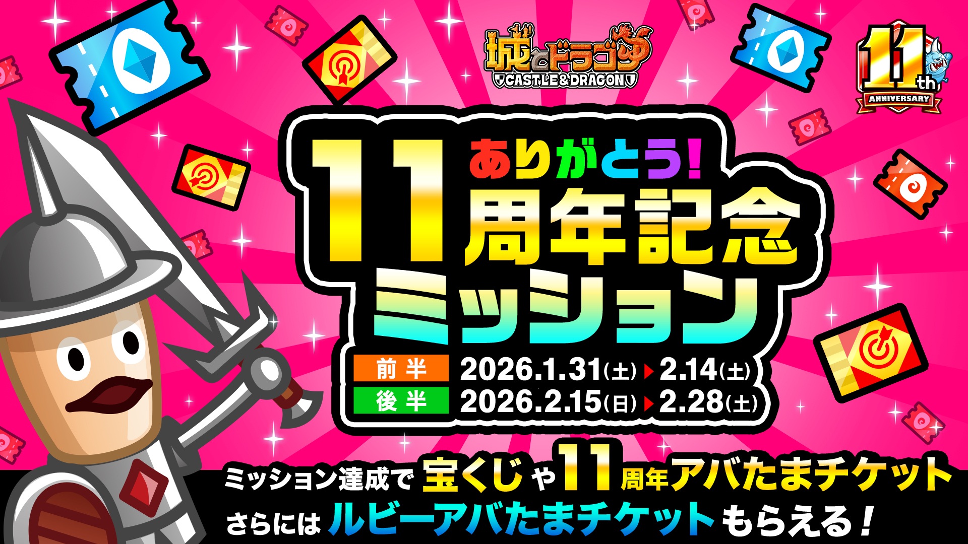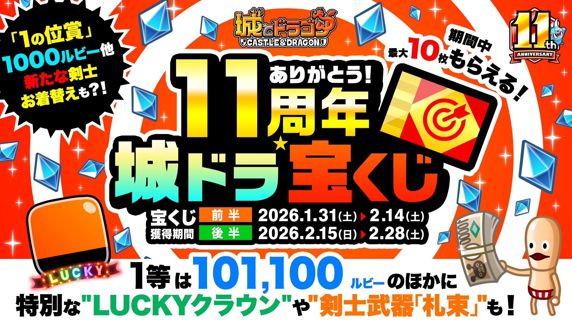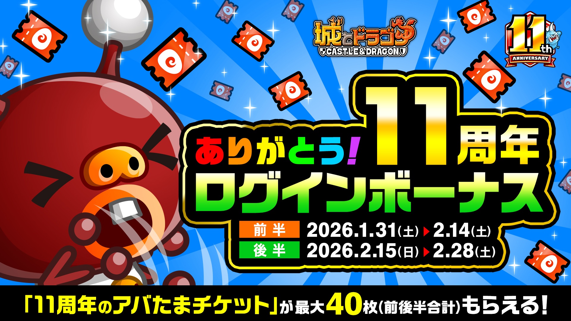 『城とドラゴン』は2026年2月5日(木)でサービス開始から11周年を迎えます。日頃よりプレイいただいているプレイヤーの皆さまには、心より御礼申し上げます。つきましては、これを記念したキャンペーン「ありがとう11周年!城ドラ超感謝祭(前半)~2/14超集合!~」が1月31日(土)より開催中です。特別なログインボーナスやミッションはもちろん、1日1回最大“11,100ルビー”が当たる!?「11周年ルビーアバたま」、最高“101,100ルビー”などが当たる「城ドラ宝くじ」、さらに「フェス腕OFF大会キャラ育成キャンペーン」や、2月14日(土)に東京国際フォーラムにて開催の「城ドラフェス2025-2026」にちなんだイベントも!11周年の『城とドラゴン』で、ぜひお楽しみください。