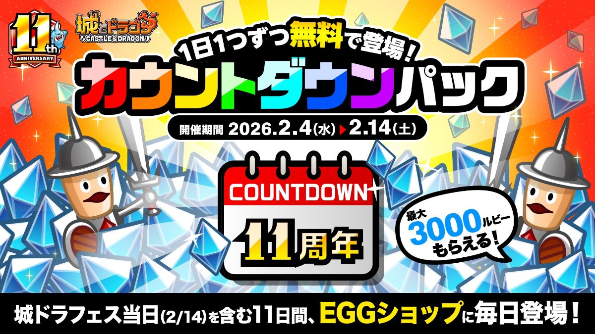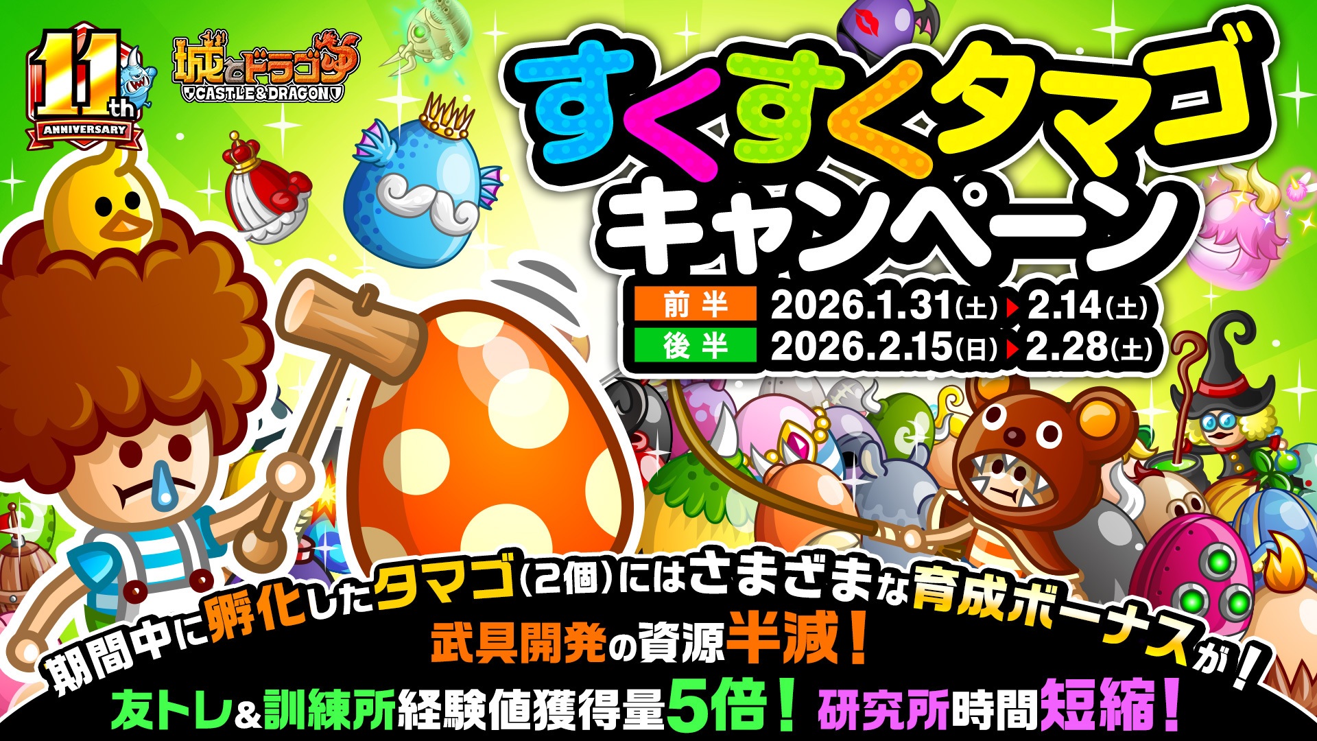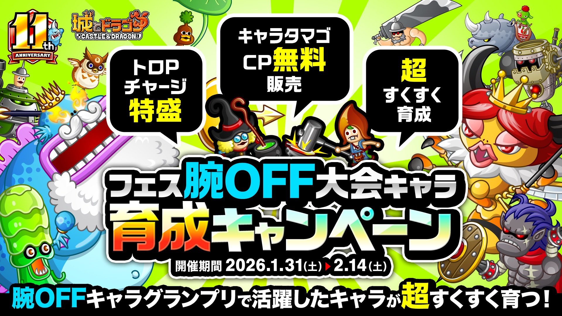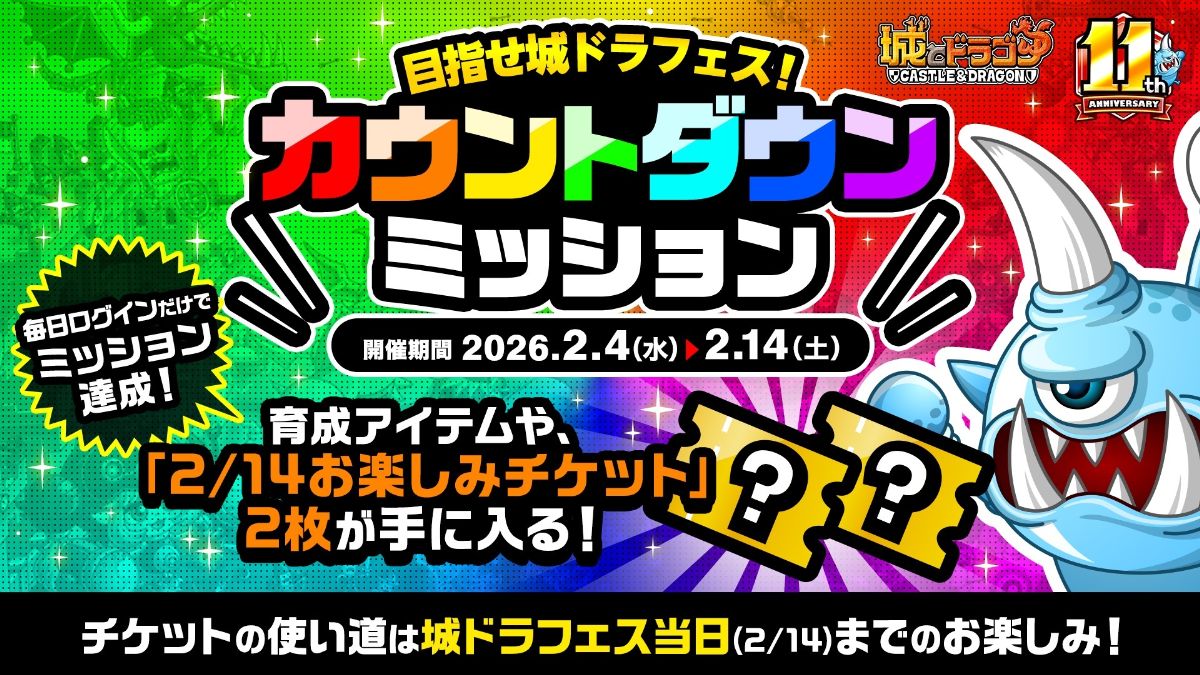 『城とドラゴン』は2026年2月5日(木)でサービス開始から11周年を迎えます。日頃よりプレイいただいているプレイヤーの皆さまには、心より御礼申し上げます。つきましては、これを記念したキャンペーン「ありがとう11周年!城ドラ超感謝祭(前半)~2/14超集合!~」が1月31日(土)より開催中です。特別なログインボーナスやミッションはもちろん、1日1回最大“11,100ルビー”が当たる!?「11周年ルビーアバたま」、最高“101,100ルビー”などが当たる「城ドラ宝くじ」、さらに「フェス腕OFF大会キャラ育成キャンペーン」や、2月14日(土)に東京国際フォーラムにて開催の「城ドラフェス2025-2026」にちなんだイベントも!11周年の『城とドラゴン』で、ぜひお楽しみください。