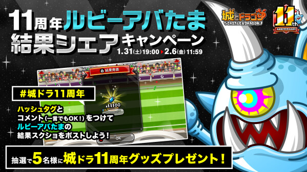 第1週目は「11周年ルビーアバたま結果シェアキャンペーン」を開催中!『城とドラゴン』公式Xアカウント(@shirotodoragon)をフォローし、「11周年ルビーアバたま」の結果スクショにハッシュタグ「#城ドラ11周年」とコメント(一言でもOK!)を付けてポストしましょう!ご応募いただいた方の中から抽選で5名様に「城ドラ11周年グッズ」をプレゼントいたします。