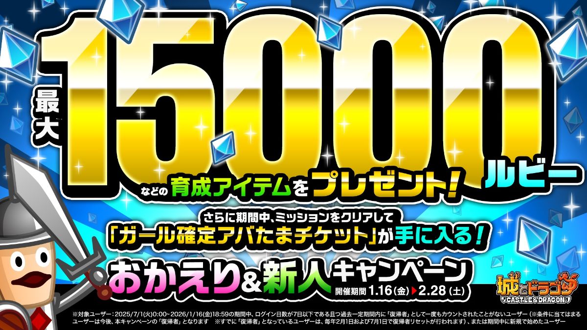 1月16日(金)より、対象ユーザーに最大15,000ルビーや「金の友トレ倶楽部」などが贈られる「おかえり&新人キャンペーン」が開催中です。期間中に対象ユーザー向けのミッションをクリアすると「ガール確定アバたまチケット」も手に入ります。