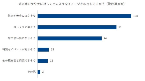 観光地のサウナのイメージをたずねたところ、最も多かったのが「健康や美容に良さそう」で108人でした。次いで、「ゆっくり休めそう」91人、「旅の思い出になりそう」74人、「特別なイベントがありそう」13人、「他の観光客と交流できそう」12人、「その他」3人と続きます。
