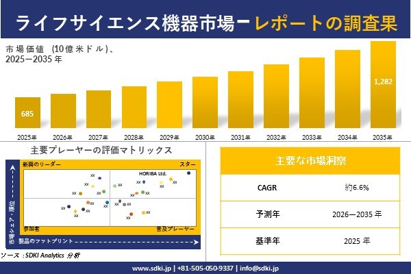 SDKI Analytics(本社:東京都渋谷区)は、このたび、2026年01月23に「ライフサイエンス機器市場調査レポート:2026-2035年の市場規模、シェア、傾向の予測」を発表しました。ライフサイエンス機器に関する市場調査レポートには、統計的および分析的アプローチを使用した予測評価が含まれています。この調査レポートでは、一次および二次調査方法を使用して分析された主要な業界洞察を通じて将来の傾向を理解できるようにすることで、主要な市場動向を読者に説明しています。