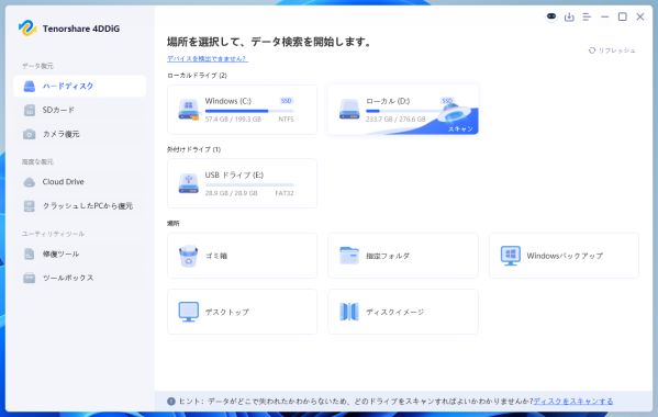 4-1 保存場所を選択する Tenorshare 4DDiGをパソコンにインストールして起動します。メイン画面で、写真が保存されていた場所(デスクトップ、ゴミ箱、または外付けHDDなど)を選択し、「スキャン」をクリックします。