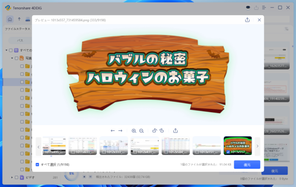 4-3 プレビューして復元する 見つかった写真をクリックしてプレビューし、復元したい写真であることを確認したら「復元」ボタンを押します。