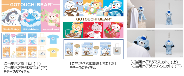 ご当地ベア富士山、山梨ピーチ、信州おこじょをモチーフにしたステッカー(400円・税別)、アクリルスタンドチャーム(700円・税別)、缶マグネット(500円・税別)、トートバッグ(1,500円・税別)、キッズTシャツ(2,200円・税別)。