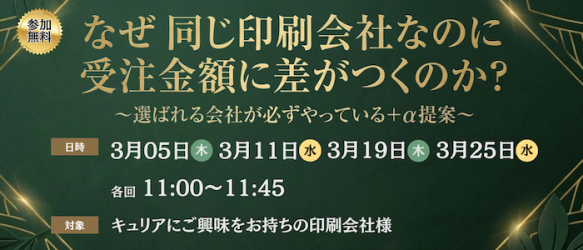 CEO:樋口 清政)は、2026年3月に印刷業界向けに、なぜ 同じ印刷会社なのに受注金額に差がつくのか? 〜選ばれる会社が必ずやっている+α提案〜 と題して、セミナーを開催することをお知らせいたします。