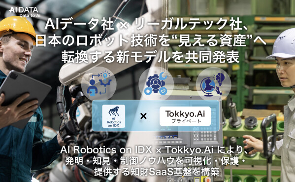 企業データとAIの利活用カンパニー、AIデータ株式会社(本社:東京都港区、代表取締役社長 佐々木隆仁、以下AIデータ社)と、リーガルテック株式会社(本社:東京都港区、代表取締役:平井 智之、以下リーガルテック社)は、日本のロボット技術の発明・知見・制御ノウハウを「見える知財資産」として可視化し、保護および販売を可能にする新たな知財SaaS連携モデル「AI Robotics on IDX × Tokkyo.Ai」を共同で発表する。