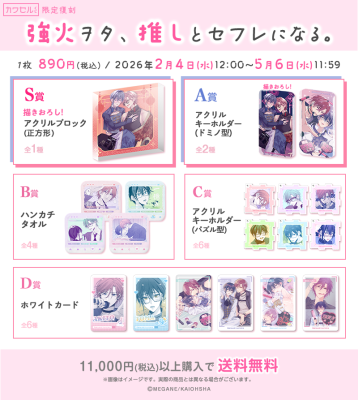 株式会社インクルーズ(東京都渋谷区、代表取締役社長 山﨑 健司)が企画・運営するフィジカルグッズのオンラインくじ「カワセルくじ 乙女部」にて、2月4日(水)より、「強火ヲタ、推しとセフレになる。」のくじの【復刻再販】が開始となりましたことをご報告させていただきます。