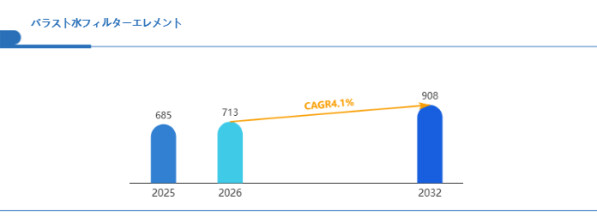 Global Reports調査チームの最新レポート「グローバルバラスト水フィルターエレメント市場規模、主要企業シェア、ランキング分析レポート【2026年版】」によると、2026年の713百万米ドルから2032年には908百万米ドルに成長し、2026年から2032年の間にCAGRは4.1%になると予測されています。